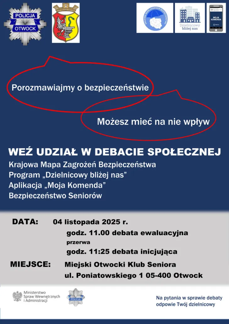 Mieszkańcy Otwocka, a zwłaszcza seniorzy, są serdecznie zaproszeni na debaty społeczne, które odbędą się 4 listopada 2025 roku w Otwockim Klubie Seniora przy ul. Poniatowskiego 1. Pierwsza z nich to debata społeczna ewaluacyjna, zaplanowana na godziny 11:00 – 11:20, podczas której funkcjonariusze policji przedstawią realizację rekomendacji z wcześniejszej debaty inicjującej, która miała miejsce 13 listopada 2024 roku. Po krótkiej przerwie, o godzinie 11:25, rozpocznie się debata społeczna inicjująca dotycząca poprawy bezpieczeństwa na terenie Otwocka.